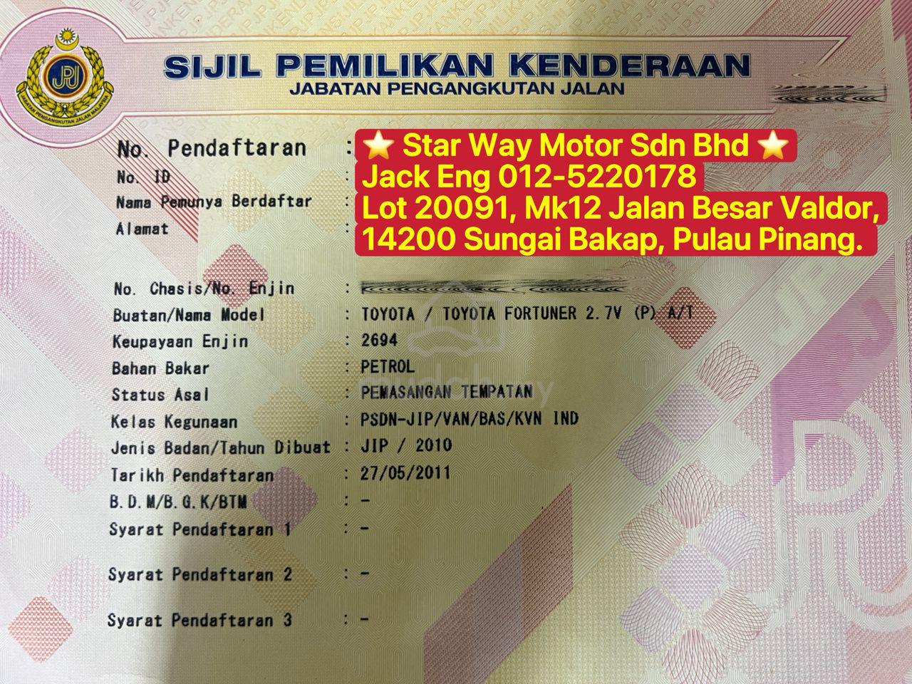 "Fortuner 2.7 Petrol"Toyota Fortuner 2.7 (V) (4X4) 2010/11 Facelift🔥 TRANSPARENT🔥 WE WARRANTY🔥 NO HIDDEN FEES🔥 HIGHER TRADE IN VALUE🔥 ACTUAL YEAR & SPECIFICATION🔥 VIEW TO BELIEVE🔥 NEGO TILL LET GO⭐️ Star Way Motor Sdn Bhd ⭐️⭐️星星汽车⭐️#NegoTillLetGo#StarWayMotorSdnBhd#星星汽车 🚗WhatsApps Or Call:0125220178 Jack Eng#Audi #Bmw #Chevrolet #Citroen #Ford #Honda #Hyundai #Isuzu #Lexus #Mazda #Mercedes #Mini #Mitsubishi #Nissan #Perodua #Peugeot #Porsche #Proton #Subaru #Suzuki #Toyota #Volkswagen