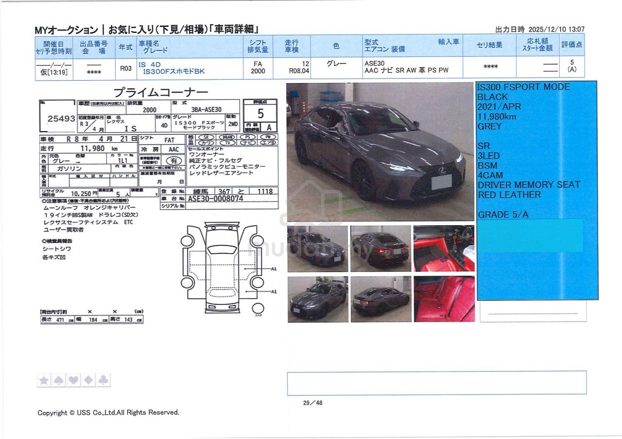 2021 Lexus IS300 F-Sport 2.0 - Mode Black Edition5A Condition12,000 km done only !!- Inspection Report Attached - Photo 2Engine:2.0L Turbo Charged EnginePower Output: 241 Horse PowerTorque: 258 lb-ftGearbox: 8 - Speed TransmissionSpecifications Included:Mode Black PackageOrange Brake Calipers360 Surround Cameras3 LED HeadlampSun RoofBlind Spot Monitoring Sensors (BSM)Digital Inner MirrorStandard Equipent:Latest Digital Meter DisplayDriving Mode Selection: Eco, Normal, Sport, Sport+Front & Rear Parking SensorsAdaptive Cruise Control (ACC)Pre-Crash System (Collision Prevention System )Lane Keep Assist (LKA)Sway Away Warning SystemBlindspot Monitoring Sensors (BSM)Lane Keep Assist (LKA)Intelligent Clearance Sonar(ICS)Rear Cross Traffic Alert (RCTA)Auto High Beam SystemTyre Pressure Measuring System (TPMS)Memory SeatFull Leather SeatsVentilation Seats (AIR-COND SEATS )12.3" MULTIMEDIA DISPLAYApple CarPlay/ Android Auto System: Waze/ Google Map/ Spotify on screenBluetooth Audio19" F-SPORT RIMS*** 6 Years Extended Warranty with open panel workshop eligible ***Coverage:- Engine- Gearbox- Cooling System- Electric Control Unit (ECU)- Fuel System- Air - Conditioner- TurboPlease Contact: 012 - 207 2890 KL Tan
