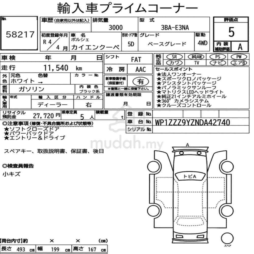 2022 Porsche Cayenne Coupe - Very High SpecsJapan Specs - 5A Condition- Inspection Report from Japan Attached (Photo 2)Options Included:Soft Close Doors - RARE !!360 Surround CamerasPDLS HeadlampKeyless Entry - RARE !!Blind Spot Indicator Sensors - RARE !!Sports Chrono Package- Include Mode Switch4 way Electronic Seats (Driver & Passenger)Upgraded 21" Sports Rims - RM 50k optionsPanoramic RoofAdaptive Cruise Control (ACC) with Radar- Lane Keep AssistMultifunction SteeringFull Leather SeatsCustomized Red color Seat BeltPower Boot with Keyless Lock Features (2 buttons)Please Contact: 012 - 207 2890 KL Tan