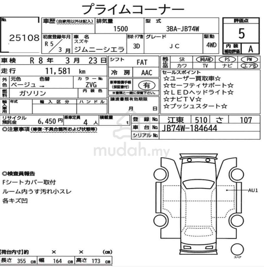 2023 Suzuki Jimny 1.5 Sierra JC Beige UNREG JAPAN 5AACall or WhatsappBryan0102878350** GRADE 5AA AUCTION CAR **** ONLY ORIGINAL 11K KM MILEAGE FROM JAPAN **>> READY UNIT <<* ACTUAL UNIT ADVERTISED WITH ACTUAL PRICE ** TRADE IN WELCOMED ** HIGH LOAN POSSIBLE ** 9-YEARS LOAN LOW INTEREST RATE FROM 2.2x% ONLY ** PRICE CAN NEGO DURING VIEWING *- Beige Exterior- Unregistered Japan CBU- High spec unit (Projector Headlight, Pre-Crash Safety System, Keyless & Push Start)- 1.5L Engine & 4AT gearbox- 2H/4H/4L Drive Mode- Hill Descent Control- Heated Seats- Digital Climate Control- Multifunction steering- Auto Wipers & Auto Headlights- Land Keep Assist- Cruise ControlCar is ready for viewing at Shah AlamCall or WhatsappBryan0102878350