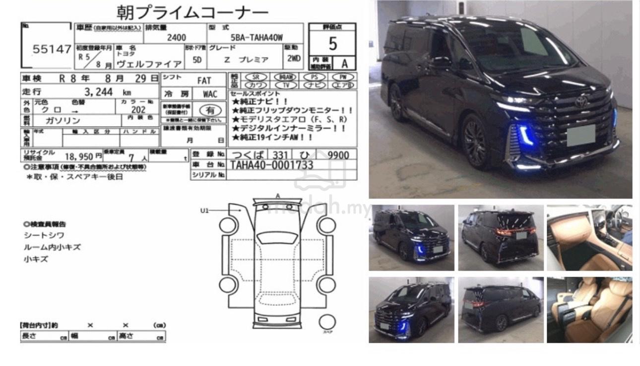 TOYOTA VELLFIRE Z PREMIER 2.4 TURBO (TAHA40) MPVRecon 2023UnregisteredLow Mileage 3k GRADE 5A ______Specs & Features ______Turbocharged 2.4-litre 4-cylinder dual VVT-i278 Horsepower 430 NM Torque - Adaptive high-beam system (AHS)- Blind spot monitoring- Curve control system (CCS)- Digital inner mirror- Door entrance light- Dynamic radar cruise control system (DRCC)- Head-up display- Lane departure alert (LDA)- NanoeX ionizer- Nappa genuine leather upholstery- Parking support brake system (PSB)- Pillar lighting- Power boot- Power side window pull-down sunshades- Pre-collision system (PCS)- Rear cross traffic alert system (RCTA)- Road sign assist (RSA)- Toyota Team Mate package- Twin panoramic glass roof with independently operable shades- Wireless AppleCarplay & Android Auto connectivity- 3 LED- 8-way power adjustable driver seat with memory function- 4-way power-adjustable front passenger seat- 12.3-inch coloured TFT instrument display- 11.7" Rear Roof Monitor- 64-colour ambient light system- 7 USB-C ports- 19-inch chrome rims- Dunlop 225/55 R19More Information Can Call Or WhatsApp 0162333456