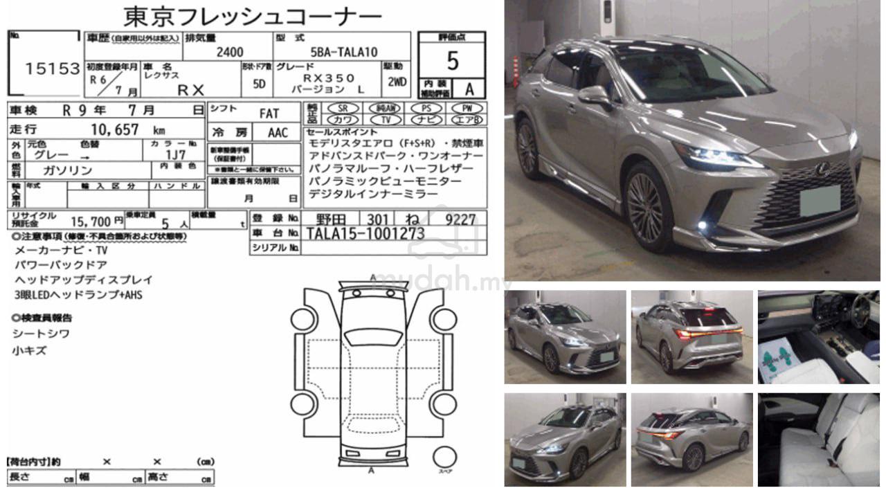 2024 Lexus RX350 Version L (Luxury) 2.4 – Very High Specs5A Condition !!10,745 km done only !!Inspection Report AttachedEngine: 2.4L Turbo Charged EnginePower Output: 245 HorsepowerTorque: 317 lb-ft @ 1700 rpmgearbox: 8 - Speed TransmissionSpecs Include:Modellista Bodykit - Very RARE !!Rear Passenger Electronic Folding Seats – RARE !!- Including Rear Passenger Ventilation SeatsAuto Parking - Very RARE !!Built-in Driving Recorder - RARE !!Panoramic Sun Roof360 Surround CamerasDigital Inner Mirror (DIM)Head Up Display (HUD)Advanced Drive SystemWireless Apple CarPlay System- 64 Ambient Light Color SelectionSafety Features:- Pre - Collision System- Advanced Drive System- Road Sign Assist- Front Cross Traffic Alert- Lane Departure Alert System- Lane Change Assist- Pro-Active Driving Assist- Rear Cross Traffic Alert- Blind Spot Motoring Sensors- Rear Vehicle Approaching Indication- Parking Supporting Brake- Rear Camera Detection- Safe Exit Assist- Approaching Vehicle Support- Parking Assist SensorsPlease Contact: 012 - 207 2890 KL Tan