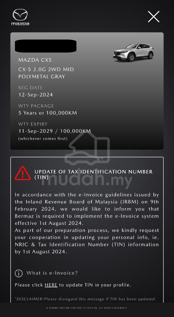 Please call for view car and infomation.LAW **013-8837131**KEN **016-3482729**CHUNG **016-2031916**Your trusted Car Dealer in Town!CAR DETAILSMazda CX5 2.0 2WD MID Facelift Year 2024- Full Service Records 32K- Warranty Until Sep 2029- Free Service Package - Full Leather Seat - Reverse Camera - Cruise Control - Multi Function Steering - Electronic Hand Brake- Auto Brake Hold - Driving Mode: Sport/Normal/Eco- Android Auto & Apple Carplay- Got Spare Key - GREAT-A CONDITION- CLEAN INTERIOR- NO REPAIR NEEDED- SMOOTH ENGINE- SMOOTH GEARBOX* ACCEPT TRADE-IN* HIGH TRADE-IN VALUE!!! WHY CHOOSE US? !!!~ WE ARE BANK DIAMOND DEALER ~~ OVER 14 YEARS IN AUTOMOTIVE INDUSTRY ~~ HIGHER TRADE IN VALUE ~~ CAR WARRANTY PROVIDED ~~ MOST REASONABLE PRICE IN MARKET ~WE ARE OPEN 7 DAYS A WEEK:9:30 a.m. - 7:00 p.m. (MONDAY TO SATURDAY)10:30 a.m. - 5:00 p.m. (SUNDAY & PUBLIC HOLIDAY)#### CARNIVAL SALES PROMOTION ######## WELCOME VIEW /TEST CAR ######## CAR CONDITION TIP TOP ####(DOCUMENTATION FOR LOAN SUBMISSION)- PLEASE BRING ALONG YOUR DOCUMENTATIONFOR FAST APPROVAL!!![PERSONAL]- I/C- LICENSE- 3 MONTHS PAYSLIP- 3 MONTHS BANK STATEMENT*Optional EPF/ EA FORM[COMPANY]- DIRECTOR I/C- COMPANY SSM FULLSET- COMPANY BANK STATEMENT 6 MONTHS[SDN BHD]- DIRECTOR I/C- FORM 9, FORM 24, FORM 44, FORM 49- COMPANY BANK STATEMENT 6 MONTHSPlease call for view car and infomation.KEN **016-3482729**CHUNG **016-2031916**LAW **013-8837131**FOR REQUIREMENTS AFTER SALES SERVICETIM ** 012-8807086**## Visit Our Showroom to Get A Quality Used Car ##TCT Automotive (M) Sdn BhdLOT PT 45861, Jalan Pinggiran Putra 1/2, Taman Pinggiran Putra, Pusat Bandar Putra Permai, 43300 Seri Kembangan, Selangor